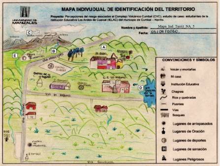 Mediante los mapas de identificación del territorio, se recopiló información de la interpretación del territorio, el reconocimiento de este, su organización y la relación que existe entre ellos. Es un territorio lleno de narrativas, que desde el diario vivir explora la memoria de los participantes, el cual invita a realizar una reconstrucción de la realidad espacial, con identidad. Las referencias simbólicas están marcadas por esos seres naturales tutelares con componente mítico, presentes desde la memoria y comprendidos desde el pensamiento. Entre las referencias simbólicas se tienen: (A) Complejo Volcánico Cumbal, incluidos sus puntos geográficos, la cobertura de hielo y emisiones de gases volcánicos como los vistos en la cima del volcán; (B) conjunto de montañas, como las deidades protectoras que rodean sus veredas, los ríos y quebradas; (C) la laguna de La Bolsa; (D) el paisaje natural compuesto por el páramo como fuente de agua y protector de especies de fauna y flora; (E) los caminos con la función de unir a los otros (ver Figura 2).