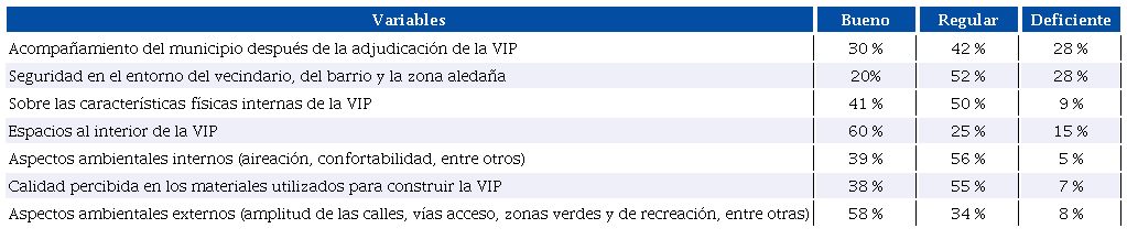 Con base en la tabla 1, el 30 % de los encuestados considera que ha recibido un acompañamiento bueno por parte del municipio después de recibir su VIP centrado en recibir orientación psicosocial, asistencia médica, programas recreativos, manejo de la propiedad horizontal, entre otros; el 42 % lo considera regular y el 28 % deficiente, por cuanto tal acompañamiento debería ser más integral. Además, el 52 % de los adjudicatarios indica que la seguridad en el entorno del vecindario, del barrio y la zona aledaña se puede catalogar como regular, un 28 % señala que es deficiente y solo el 20 % lo valora como bueno.