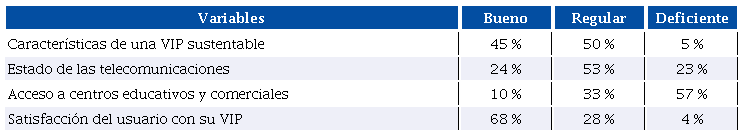 En referencia a las características de una VIS sustentable (ver tabla 2), el 45 % indica que su VIP es bastante favorable para mantenerse saludable y mejorar su calidad de vida, el 50 % percibe estos aspectos con efecto moderado y el 5 % cree que ha sido desfavorable, sobre todo por la ubicación en la periferia y la inseguridad puede causar algunos riesgos para la vida e integridad física de las personas; además, la mayoría considera que el barrio posee una considerable seguridad ambiental.