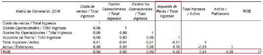 La matriz de correlación del año 2016 permite evidenciar (ver recuadros rojos de la Figura 2) que la relación del ROE con sus variables explicativas es principalmente escasa, salvo la relación Activo/Patrimonio y ROE que es débil.