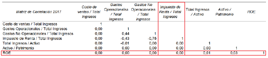 En la revisión de resultados del año 2017, se evidencia que la relación entre el ROE y sus variables explicativas es escasa (ver recuadros rojos de la Figura 3).