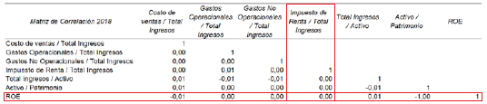 De acuerdo con los resultados obtenidos de la correlación junto con las regresiones, se puede afirmar que no hay evidencia estadística que permita afirmar que el impuesto de renta en las empresas de la muestra sea una variable que afecte (de manera positiva o negativa) la rentabilidad sobre el patrimonio.