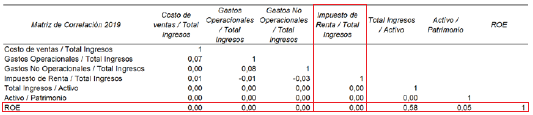 Finalmente, en el 2019, la variable Total Ingresos/Activo muestra una relación moderada positiva con el ROE (ver recuadros rojos de la Figura 5), para el resto de las variables, la relación es escasa.