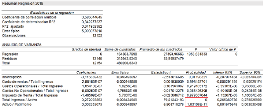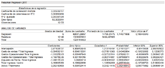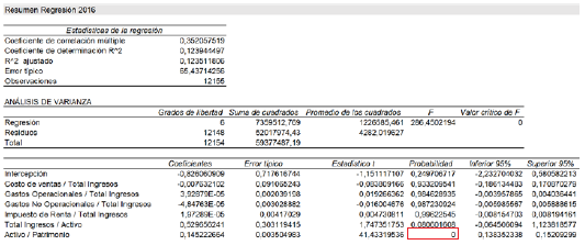 En el análisis de regresión de 2016, se puede ver que la única variable estadísticamente significativa es Activo/Patrimonio (ver recuadro rojo de la Figura 6).