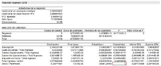 En el 2018 las variables Activo/Patrimonio, siguen mostrando significancia estadística como se observa en el recuadro rojo de la Figura 8.