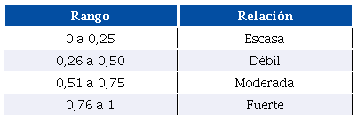 Para facilitar el análisis de correlación entre el ROE y sus variables explicativas se definen las siguientes escalas para determinar la magnitud de la relación con base en lo sugerido por Martínez, Tuya, Martínez, Pérez y Cánovas (2009).