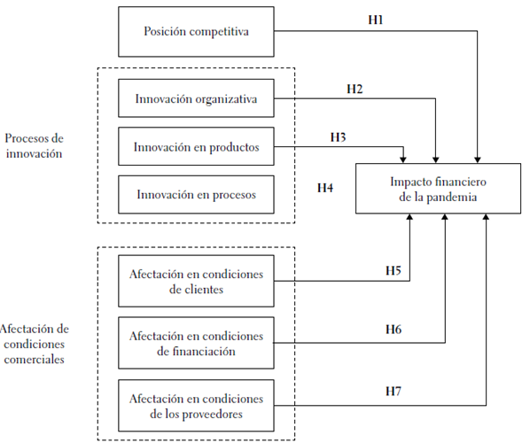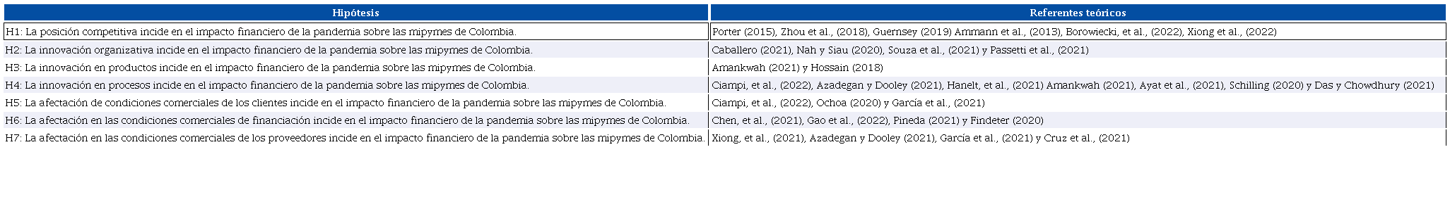 Con el fin de analizar los factores determinantes del impacto financiero de la pandemia sobre las mipymes de Colombia que lograron sobrevivir al Covid-19, se proponen las hipótesis que se presentan en la tabla 1.