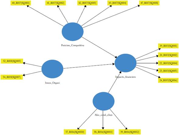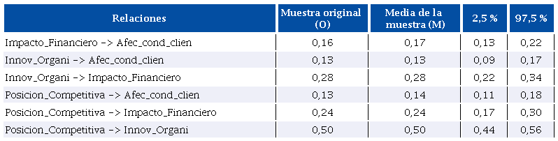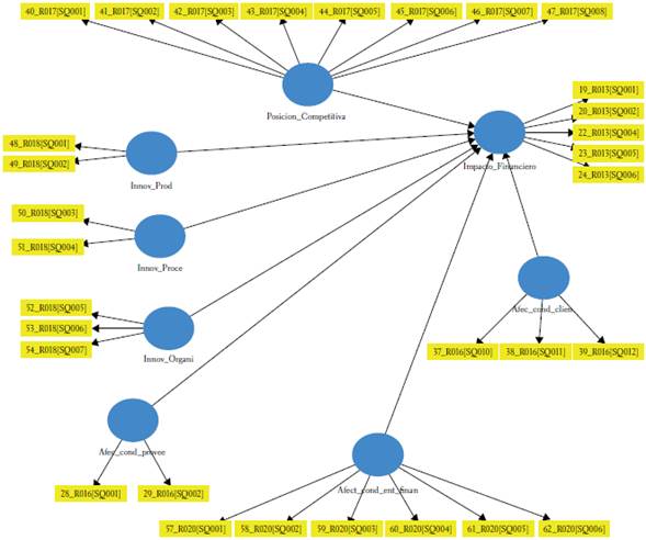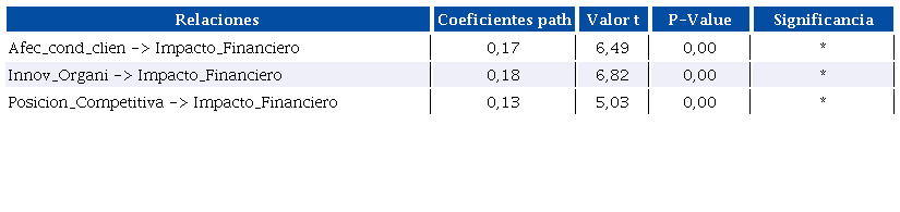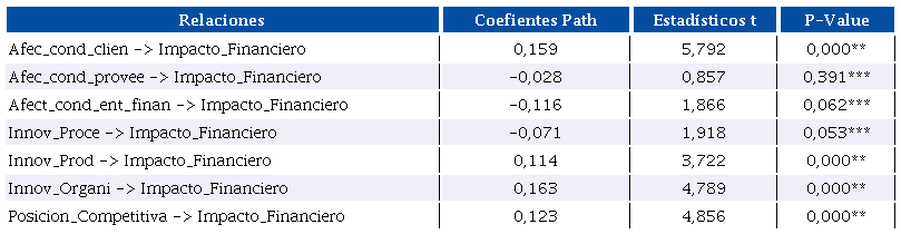 De acuerdo con Hair et al. (2017), los coeficientes path por encima de 0,10 suelen ser significativos, y los inferiores a 0,10 suelen no ser significativos. Como se observa en la tabla 4, las relaciones de Afec_cond_clien, Innov_Prod, Innov_Organi y Posicion_Competitiva son significativas, mientras que las relaciones Afec_cond_provee, Afect_cond_ent_finan e Innov_Proce no son significativas con respecto al Impacto_Financiero, por tal razón se procedió a retirar estos factores del modelo. Esta decisión se corrobora con los P-Value que obtuvieron valores superiores a 0,05, considerados no significativos.