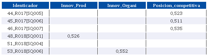 Con el objetivo de realizar la evaluación del modelo de medida reflectivo se hicieron las estimaciones de las relaciones entre las variables latentes reflectivas y sus indicadores (cargas externas). Aquellos ítem cuyas cargas no fueron significativas, es decir, inferiores a 0,60 (Bagozzi y Baumgartner, 1994; Bagozzi y Yi, 1988) se procedió a eliminarlos, dada la menor fiabilidad individual del ítem. Igualmente, aquellos factores que al eliminar el indicador solo quedaron medidos por un ítem, como es el caso de Innov_Prod, se eliminaron siguiendo la recomendación de Diamantopoulos et al. (2012). Los indicadores eliminados con su correspondiente carga se pueden observar en la tabla 5.