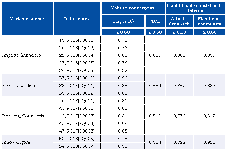 Con respecto a la validez convergente, se puede observar que las cargas (λ) están por encima del valor mínimo de 0,60, al igual que su varianza extraída media (AVE), lo que sugiere niveles suficientes de fiabilidad del indicador (Bagozzi y Baumgartner, 1994; Bagozzi y Yi, 1988). De otra parte, en relación con la fiabilidad de consistencia interna, tanto el alfa de Cronbach como la Fiabilidad Compuesta de cada variable latente están por encima del valor mínimo aceptable (0,60), de acuerdo a los criterios establecidos por autores como Nunnally y Bernstein (1994) y Bagozzi y Yi (1988).