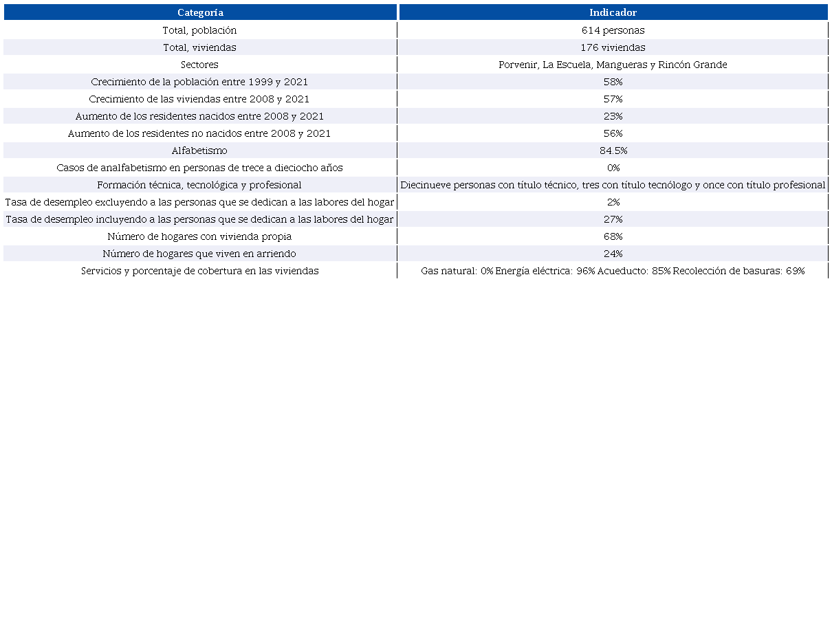 La Tabla 2 presenta algunos indicadores socioeconómicos de la vereda, los cuales evidencian su crecimiento y evolución desde 1999, año en el que se realizó el primer censo poblacional.