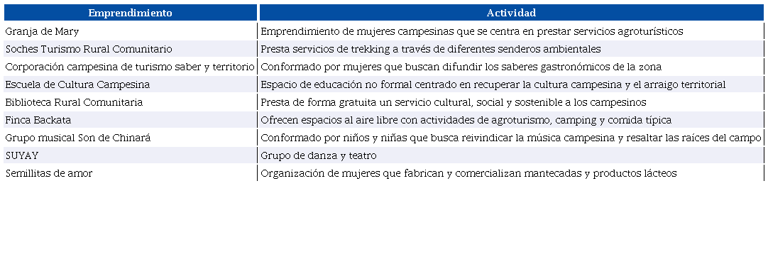 Adicionalmente, la recuperación y la protección de la identidad campesina ha implicado comunalidad, esto es, transitar y fortalecer un camino relacional en el interior de la población y de esta con el territorio. Actualmente, los habitantes de la vereda continúan dinamizando diferentes estrategias dirigidas a conservar su territorio y su vocación campesina, por lo cual desarrollan lo que ellos denominan “emprendimientos rurales” centrados en actividades alternativas a la producción agropecuaria (véase la tabla 3); aproximadamente “el 22% de las familias cuentan con un emprendimiento propio o participan de uno” (Valero et al., 2022). Llama la atención la resignificación de la noción neoliberal de emprendimiento dentro de la perspectiva de economía popular. La denominación “emprendimientos rurales” constituye en sí misma una expresión del neoliberalismo desde abajo.