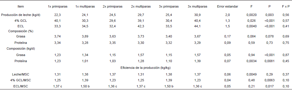 El promedio de la PL en las vacas ordeñadas 3x / d se incrementó en 2,9 kg/d en comparación con las vacas ordeñadas 2x / d (TABLA I). Vacas multíparas produjeron 8,2 kg/d (25,5%) más leche en el transcurso del experimento que las vacas primíparas. Las vacas ordeñadas 3x / d aumentaron su promedio de producción de leche comparadas con las vacas ordeñadas 2x / d, lo que es consistente con los resultados de la revisión de literatura previa [11, 12, 15]. Sin embargo, la magnitud de la respuesta de la producción de leche en el presente estudio (8,3%) fue menor que los aumentos reportados previamente en la PL de 10,4 a 19,9% [1, 2, 12, 15, 27]. Es posible que la etapa de lactancia de las vacas utilizadas en este estudio (149,5 ± 31,3 d en leche en el inicio) se vea afectada por su sensibilidad al tratamiento. En relación a 2x / d, las vacas ordeñadas 3x / d aumentaron la PL en un 10,4% medida desde el momento de parto [15]. De esta manera se obtiene más leche en la lactancia de las vacas 3 x/d. Vacas primíparas y vacas ordeñadas 3x / d tienden a tener menor porcentaje de grasa que las vacas multíparas y vacas primíparas ordeñadas 2x / d, pero las vacas ordeñadas 1x / d son las que más producen grasa (1.2 kg/d). La producción de grasa en la leche fue menor para las vacas primíparas comparadas con vacas multíparas como consecuencia de una menor producción de leche y menor porcentaje de grasa producida por las vacas de primer parto. En el estudio actual, vacas ordeñadas 3x / d; tendieron a producir leche que fue 0,3% puntos porcentuales más baja en grasa que la leche de vacas ordeñadas 2x / d, lo que es consistente con investigaciones previas [15, 27]. Sin embargo, a pesar de la mayor PL de vacas ordeñadas 3x / d, el número de ordeños no afectó el rendimiento de grasa de la leche, resultado que no está de acuerdo con previas investigaciones [5, 15, 27], en donde se encontró que la frecuencia de ordeño afectó el rendimiento de grasa en la leche. Las vacas ordeñadas 1x / d mostraron 0,1 kg/d menor producción de proteína comparada con 2x como resultado de la reducción en la producción de leche. Igualmente se observó en las vacas 2x comparadas con vacas ordeñadas 3x / d (0,5 kg/d). Vacas primíparas produjeron 0,3 kg/d menos proteína que las vacas multíparas. Como resultado, las vacas de primer parto y vacas ordeñadas 2x / d produjeron 4% menos de GCL y ECL que las vacas multíparas y vacas ordeñadas 3x / d, respectivamente. Las vacas ordeñadas 3x / d tuvieron una mayor eficiencia en la producción de leche. Hubo una tendencia de interacción entre el número de partos y el tratamiento, de tal manera que las vacas multíparas ordeñadas 3x / d tuvieron una mayor eficiencia ECL en comparación con vacas ordeñadas 2x / d. Las vacas 1 x/ d fueron las de menor eficiencia en ECL. No se encontraron otras interacciones entre el número de partos y el tratamiento para ninguna otra variable como PL., composición físico-química o de eficiencia.