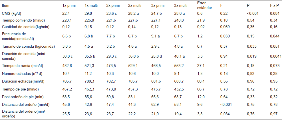 La interacción entre el número de partos y el tratamiento tamaño de la comida y la duración de la comida; las vacas primíparas ordeñadas 3x / d consumieron más frecuentemente, gastaron menos tiempo, y el tamaño de la comida consumida fue más pequeña.
