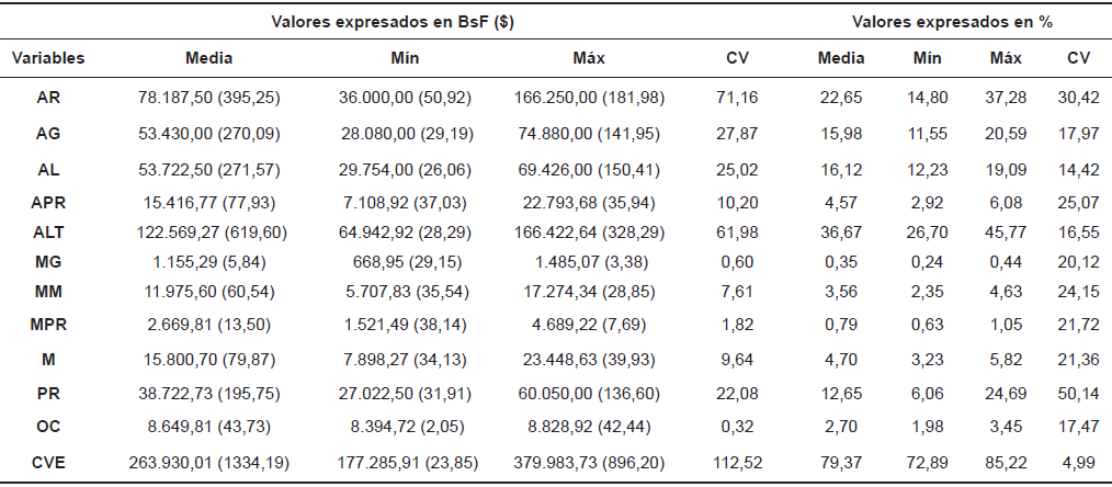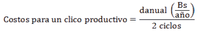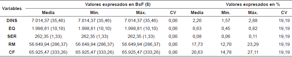Se procedió a registrar y cuantificar los costos variables (CVE) y los costos fijos (CF), según las actividades realizadas en la UP. Se reportaron los valores de los diferentes costos en Bolívares y dólares estadounidenses ($, tasa de conversión SIMADI 13/06/2015), con la finalidad de generar un valor comparativo a nivel internacional. Las siguientes fórmulas fueron consideradas para realizar los cálculos: