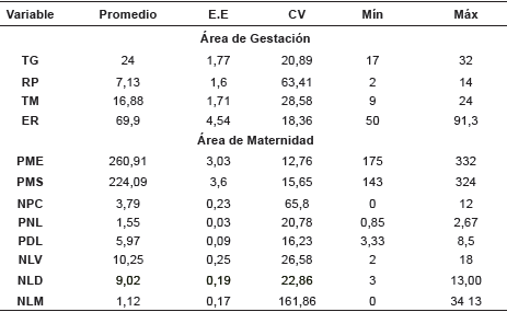 Para el análisis de los datos, se utilizó el programa InfoStat Versión E [12], aplicando estadística descriptiva, obteniendo valores promedios, máximos, mínimos y coeficiente de variación en las variables evaluadas. Para la consideración del efecto de número de partos, se aplicó un análisis de varianza (P<0,05).