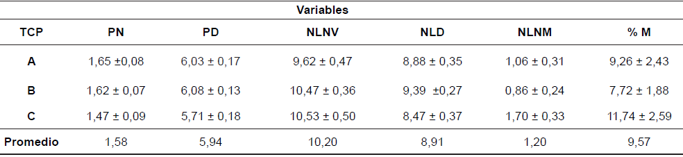 En el caso de NLNV y NLNM relacionado con el número de partos de la cerda (TABLA II), los resultados obtenidos difieren con los de algunos autores [14, 15], quienes describen que las cerdas primerizas tienen menor cantidad de NLNV con respecto a las cerdas de cuatro partos, y en relación a el NLNM, también se encontraron diferencias en el promedio por el número de parto en cerdas donde las de seis partos fueron diferentes con respecto a las de dos y tres partos. Esto se explica por la mayor duración del parto en hembras de mayor edad, lo que incrementa la mortalidad durante el parto. Por su parte, Ordaz y col. [23], reportaron que las cerdas que presentaron menor cantidad de NLNV fueron cerdas de primer parto, señalando que la causa de la menor cantidad de NLNV en cerdas primíparas (primer y segundo parto) es por inmadurez de la cerda, así como por una deficiencia en la atención del parto por parte de los operarios del sistema. Esa situación ocasiona en la UP mayor mortalidad durante el proceso de parto [2, 26].