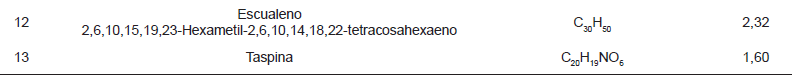 Otra novedad en esta investigación es la presencia de escualeno en el látex de Croton lechleri, la cual es de gran importancia dado el valor medicinal que tiene este compuesto estructuralmente similar al beta-caroteno [21]. El escualeno es un hidrocarburo triterpénico poliinsaturado (C30H50), usado en la industria cosmética debido a que contribuye a restablecer el equilibrio natural de la humedad de la piel; además, es un emulsificante, antinflamatorio, bactericida, antifúngico, anticancerígeno y sirve como un antioxidante natural [23,38, 49].