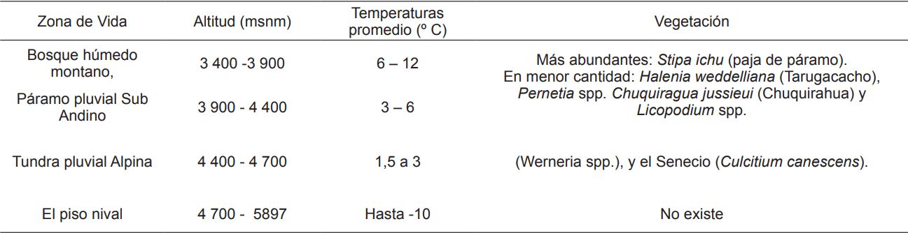 El parque nacional Cotopaxi es un área protegida de Ecuador, situada en el límite de las provincias de Pichincha y de Cotopaxi, entre 0° 41′ 03″ LS y los 78° 26′ 14″ LW; posee cuatro pisos climáticos o zonas de vida, con altitud, temperaturas, vegetación muy variables (TABLA I) y las precipitaciones promedio anuales fluctúan entre 1 000 y 2 000 mm. L a topografía del terreno es irregular, según datos existentes en el Centro Meteorológico Rumipamba-Salcedo, Cotopaxi, Instituto Nacional de Meteorología e Hidrografía de Ecuador [12].