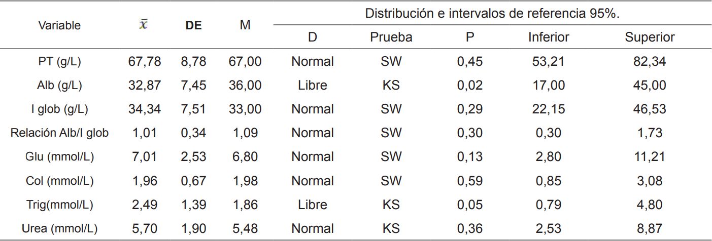 De los metabolitos bioquímicos (TABLA II), las PT, inmunoglobulinas, glucosa, colesterol y urea presentaron distribución normal en sus valores, según las pruebas de normalidad (P> 0,05) por lo que se determinaron los parámetros de referencia para el rango de pesquisaje (Ẋ ± 1,65 DE), que comprende el 90% de la población; para la Alb y los triglicéridos, con tendencia a la normalidad según la prueba KS de bondad de ajuste (P> 0,05) se calcularon los límites de tolerancia para una distribución libre, para el 90% de la población [2].