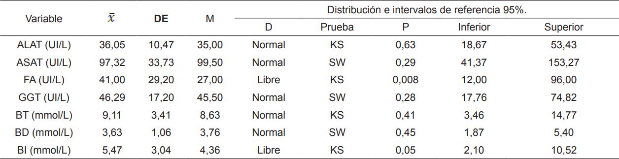 Los valores de la ALAT, ASAT, GGT y la bilirrubina total y la directa (TABLA III) presentaron distribución normal, con pruebas de normalidad (P> 0,05) por lo que se determinaron los parámetros de referencia para el rango de pesquisaje (Ẋ ± 1,65 DE), que comprende el 90% de la población y los de la FA y BI tuvieron tendencia a la normalidad según las prueba de bondad de ajuste (P> 0,05) y se calcularon los límites de tolerancia para una distribución libre para los mismos, para el 90% de la población [2].