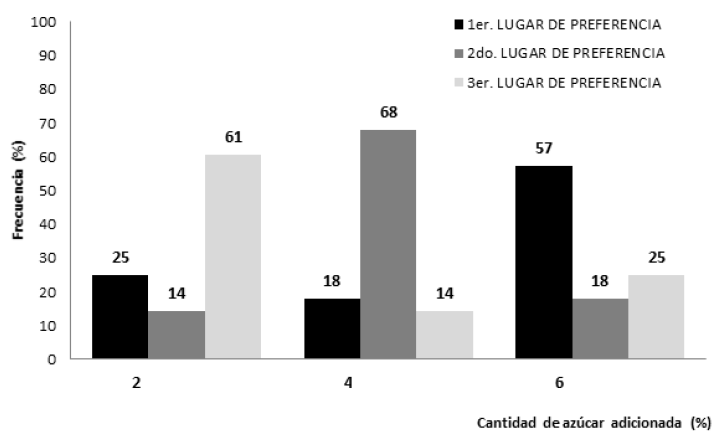 De acuerdo a estos resultados, la formulación mayormente preferida es con 6% de azúcar adicionado, dejando claro que ese porcentaje fue adicionado después de la fermentación y mejora las características sensoriales de las bebidas fermentadas.