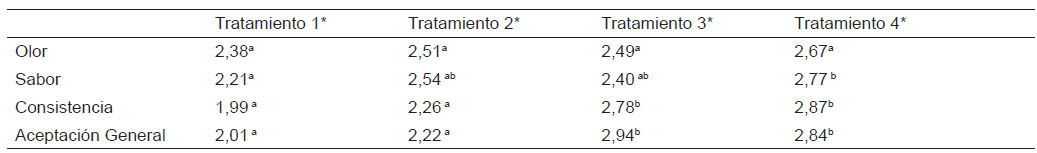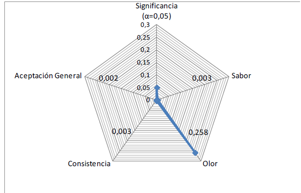 En la FIG. 4 se puede apreciar como el valor P para los atributos aceptación general, sabor y consistencia obtenidos del ANOVA no paramétrico de Friedman, refleja que existen diferencias estadísticamente significativas entre los cuatro tratamientos. Sin embargo, para el atributo olor, el valor P evidenció que no existen diferencias significativas entre tratamientos.