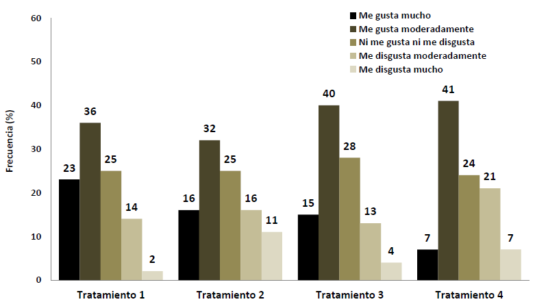 En el siguiente nivel de aceptación denominado ¨me gusta moderadamente¨, los porcentajes obtenidos evidencian porcentajes muy similares para los cuatro tratamientos, siendo 36% para el tratamiento 1, 32% para el tratamiento 2, 40% para el tratamiento 3 y 41% para el tratamiento 4. Un efecto similar en las respuestas se observa en el siguiente nivel de aceptación ¨ni me gusta ni me disgusta¨, y en los dos últimos niveles se aprecian porcentajes considerablemente menores.