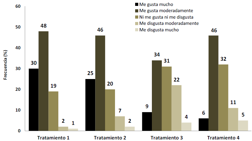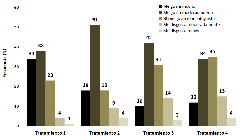Para el tratamiento 1, un 72% de las respuestas se concentraron entre el nivel ¨me gusta mucho¨ (34%) y ¨me gusta moderadamente¨ (38%). Para el tratamiento 2, un 69% de las respuestas se ubicaron igualmente entre los dos primeros niveles, obteniendo 18% para el nivel ¨me gusta mucho¨ y un 51% para el nivel ¨me gusta moderadamente¨.