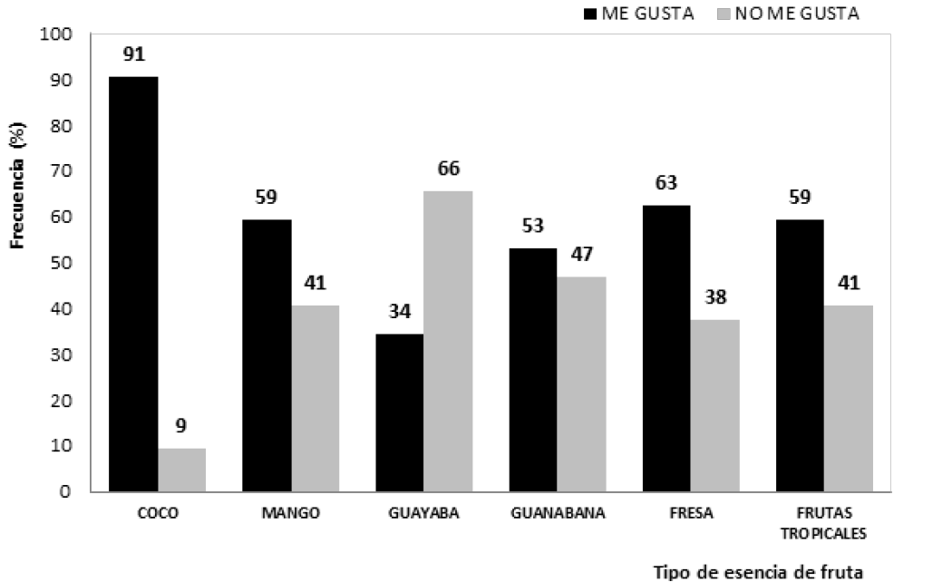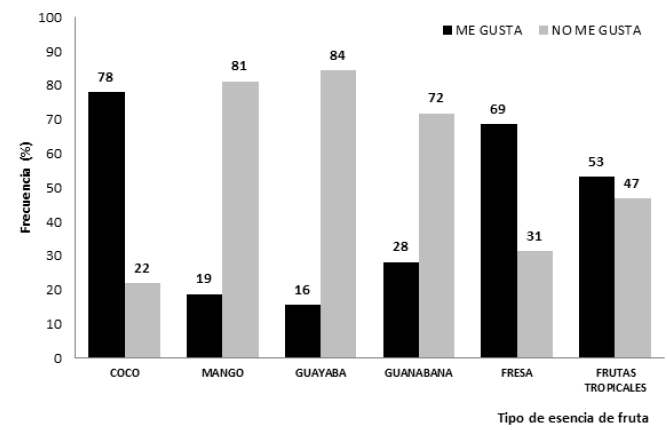 En la evaluación del sabor de las esencias de frutas (FIG.2), la esencia de coco obtuvo mayor aceptación con un 78% de¨me gusta¨. En segundo lugar estuvo la esencia de fresa con un69% de aceptación. En tercer lugar estuvo la esencia de futastropicales con un 53% de aceptación. Y en los últimos tres lugaresquedaron las esencias de guanábana, mango y guayaba conbajos niveles de aceptación del 28; 19 y 16%, respectivamente.