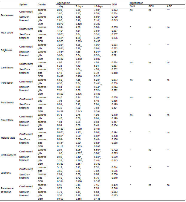 The ageing time influenced a number of pork characteristics although its effect had limited benefit for the sensory attributes of m. Longissimus thoracis from Creole BEC pigs. Ageing time had significant effect (P < 0.05) on the tenderness, brightness, unctuousness and juiciness (TABLE IV). The values of the four traits were significantly higher (P < 0.05) as the ageing time increased. Similar results were reported by Juárez et al. [24] who analyze the evolution of the sensory characteristics of samples from m. Longissimus thoracis aged for 2, 7 and 14 d. Their results showed that initial and overall tenderness, juiciness and flavour intensity increased (P < 0.01) from d2 to 14, which they attribute to ageing increases the concentration of flavour precursors, responsible for forming the characteristic meat flavour during cooking. Ngapo et al. [31] found that ageing time had significant effects (P < 0.05) on the sensory quality when grilled or shabushabu, but not when roasted. These authors indicated that grilled pork at the longer ageing period had stronger sweet taste and caramel, more panelists made notes and a greater number of notes were obtained for the pork that had been stored 43 d than for 5 d. The enzymatic action is the most important factor affecting meat tenderization [39]. Juiciness showed a similar evolution along ageing between groups, in contrast to the results obtained by Campo et al. [7].