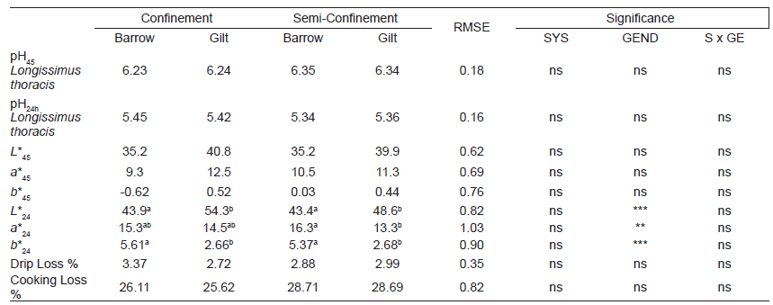 All groups showed similar values of pH45and pH24h (TABLE III), darker than that of indoor pigs, which coul probably be due to an enlarged spontaneous activity, leading to an increased mean fiber cross-sectional area. As regards meat color measurements considered to be within a normal pH range for pigs that do not produce Pale Soft and Exudative (PSE) meat, to those recorded in most of the reviewed literature. The average values recorded by Fortina et al. [12] for pH45are higher than those observed in our study (6.48 vs. 6.29 and 6.06 vs. 5.39, respectively), while the pH fall was lower (0.42 vs. 0.89 in the present study), revealing an incomplete post mortem glycolysis associated with pre-slaughter stress. In the present study, the rearing system and gender had no significant effect (P> 0.05) on pH measured both 45 min and 24 h post-mortem. Other authors [14, 38] have also found that sex does not influence the pH. However, in the literature, the effect of sex on ultimate pH remains unclear [3].