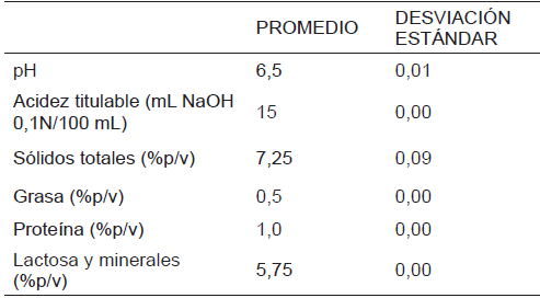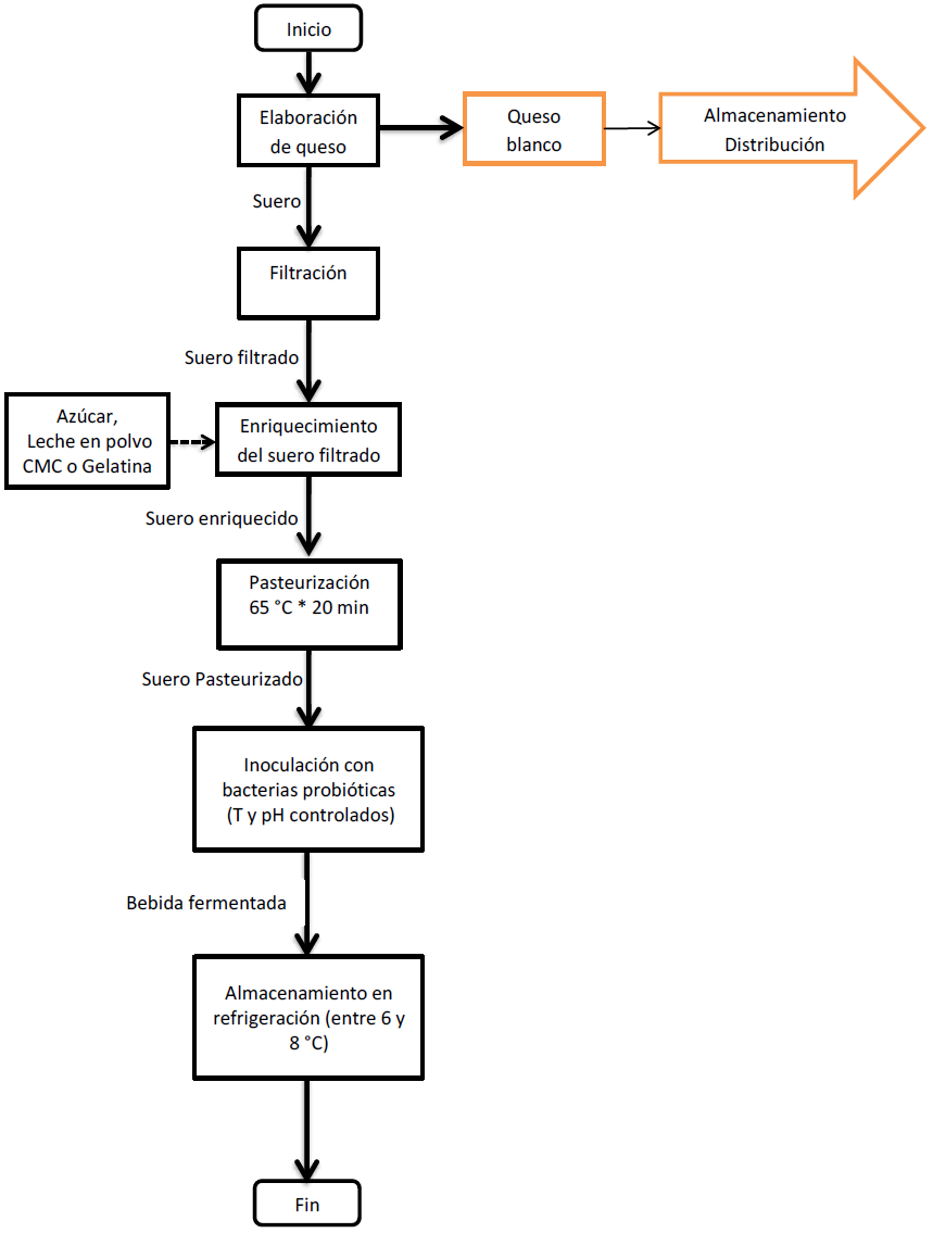El LS obtenido de la fabricación del queso se estandarizó, aumentando el porcentaje de sólidos totales para alcanzar una consistencia similar a la de la leche (aumento de la viscosidad), a través del uso de sacarosa, leche en polvo, Carboximetilcelulosa (CMC) y/o gelatina sin sabor (GSS) dependiendo del tratamiento. Adicionalmente se sometió a un proceso de pasteurización lenta, haciendo uso de un baño María (IKA-Works®, Inc. EUA) a 65oC, controlando la temperatura por 20 minutos. La pasteurización se realizó con el objeto de eliminar la carga microbiana patógena, inactivar las enzimas coagulantes y reducir la concentración de bacterias lácticas presentes, evitando la competencia de éstas con las bacterias inoculadas para la fermentación.