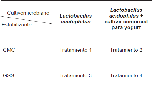 Se realizaron cuatro combinaciones de tratamientos, ensayando con los dos cultivos y los dos estabilizantes, tal como se muestra en la TABLA II. El diseño corresponde a un arreglo bifactorial 22.