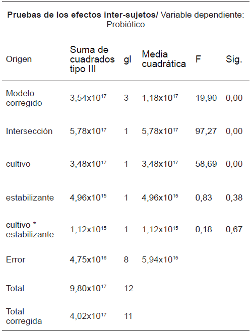 En la TABLA III se presenta el ANOVA de dos factores. De acuerdo a estos resultados, el factor que afecta el recuento de microorganismos probióticos es el tipo de cultivo empleado (P=0,00%); ni el estabilizante (P=38%) ni la interacción cultivo- estabilizante (P= 67%) afectan esta característica (α=5%).