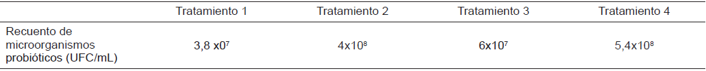 En la TABLA IV se muestran los resultados promedio del tipo del recuento de microorganismos probióticos para cada uno de los tratamientos. Se observa cómo los tratamientos en los cuales se empleó el cultivo mixto compuesto por L. acidophilus y cultivo comercial para yogurt (tratamientos 2 y 4) obtuvieron un recuento mayor que aquellos en donde se empleó el cultivo de L. acidophilus (tratamientos 1 y 3).