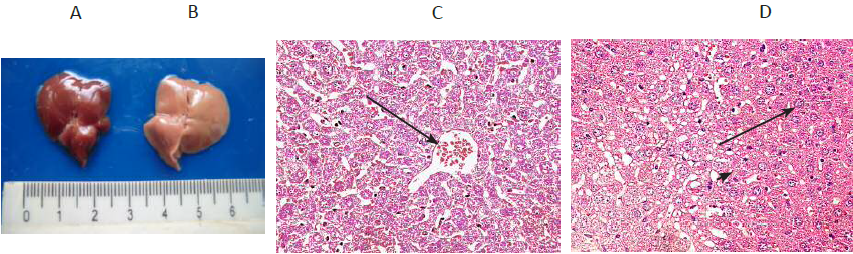En la FIG. 1A se observa el aspecto macroscópico del hígado de ratón macho NMRI adulto control con tonalidad oscura y en la FIG.1B el hígado de un animal inyectado con DL-etionina, el cual presenta color claro a diferencia del animal control. El estudio histológico del hígado de ratones machos NMRI adultos controles mostró células hepáticas con un aspecto normal (FIG.1C). Sin embargo en el hígado de los ratones tratados con DL-etionina se observó metamorfosis grasa hepática moderada, con vacuolas citoplasmáticas grandes y pequeñas en los hepatocitos y presencia de megalocitos y células en anillo de sello (FIG. 1D).