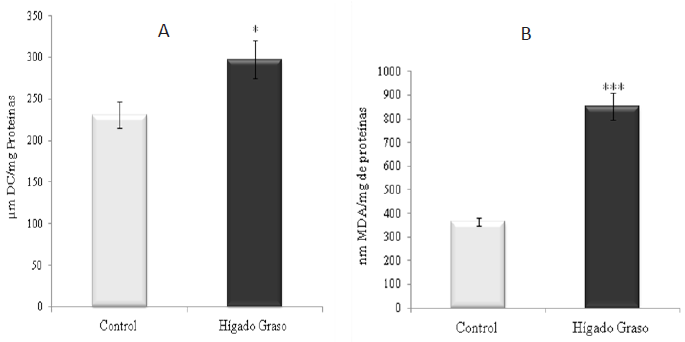 Cuantificación de los productos de la degradación lipoperoxidativa: En el sobrenadante del homogeneizado hepático, se determinó la concentración de dienos conjugados (DC), a través de la técnica descrita por Wallin [22] y también la concentración de malondialdehído (MDA) mediante el método de TBARS (sustancias reaccionantes con el ácido 2-tio barbitúrico) de acuerdo a Ohkawa [21].