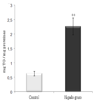 Los hígados de los ratones machos inyectados con DL- etionina presentaron una elevación significativa (P<0,01) de los TG hepáticos a 2,26 ± 0,30 mg/mg proteínas de 0,63 ± 0,08 mg/mg proteínas obtenido en los hígados de los animales controles (FIG. 3), resultados que apoyan lo observado en el estudio histopatológico.