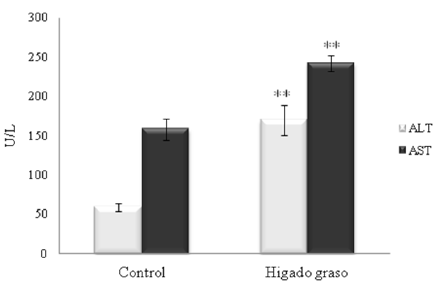 La administración de DL-etionina a ratones machos NMRI adultos aumentó significativamente (P<0,01) la actividad plasmática de la enzima alanina amino-transferasa (ALT) a 169,86 ± 18,78 U/L al comparar con el valor control de 59,40 ± 5,16 U/L, como es mostrado en la FIG 4. De igual manera la actividad de la aspartato amino transferasa (AST) se incrementó significativamente (P<0,01) a 241,93 ± 10,14 U/L en los ratones machos con hepatoesteatosis inducida por DL-etionina, en relación a la actividad control de 158,35 ± 13,54 U/L (FIG 4).