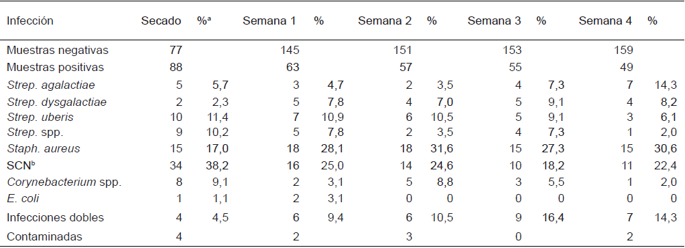Después del parto, únicamente se cultivaron las muestras de leche tomadas a las vacas y novillas con un RCS superior a 200.000 y 100.000 células/mL, respectivamente. A partir de la primera semana posparto, se tomaron muestras de 208 vacas incluyendo las novillas de primer parto. No obstante, todos los datos de estos animales no fueron usados en el análisis por las razones descritas al inicio de esta sección. Los valores observados para la curación durante el secado y el número de nuevas IIM fueron superiores a lo descrito en vacas bajo condiciones de producción de Norte América (i.e. confinamiento) [12].