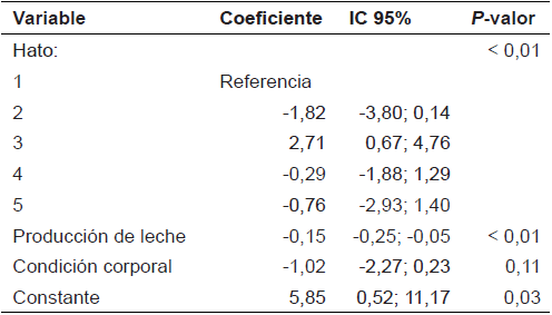Evaluando el RCS por razas se encontró que existen diferencias significativas (P<0,001) entre la raza Holstein y la raza Normando, donde la raza Normando presentó los valores más altos, posiblemente debido a que en el hato de vacas Normando, el ordeño era manual. Sin embargo, al realizar el análisis multivariado se encontró que las variables raza, número de partos no estaban asociadas con el resultado de interés (IIM postparto), por lo tanto fueron removidas del modelo final, TABLA II.