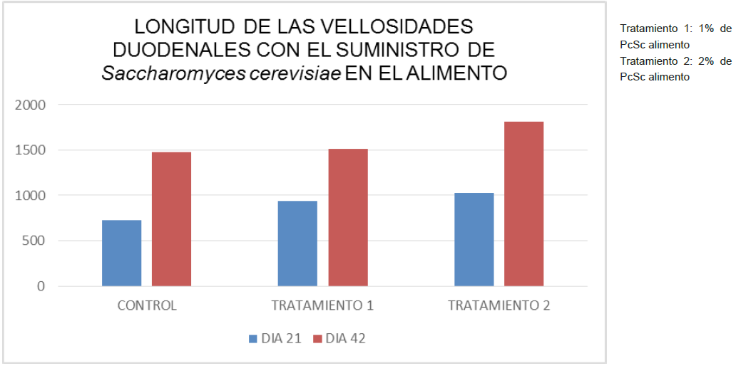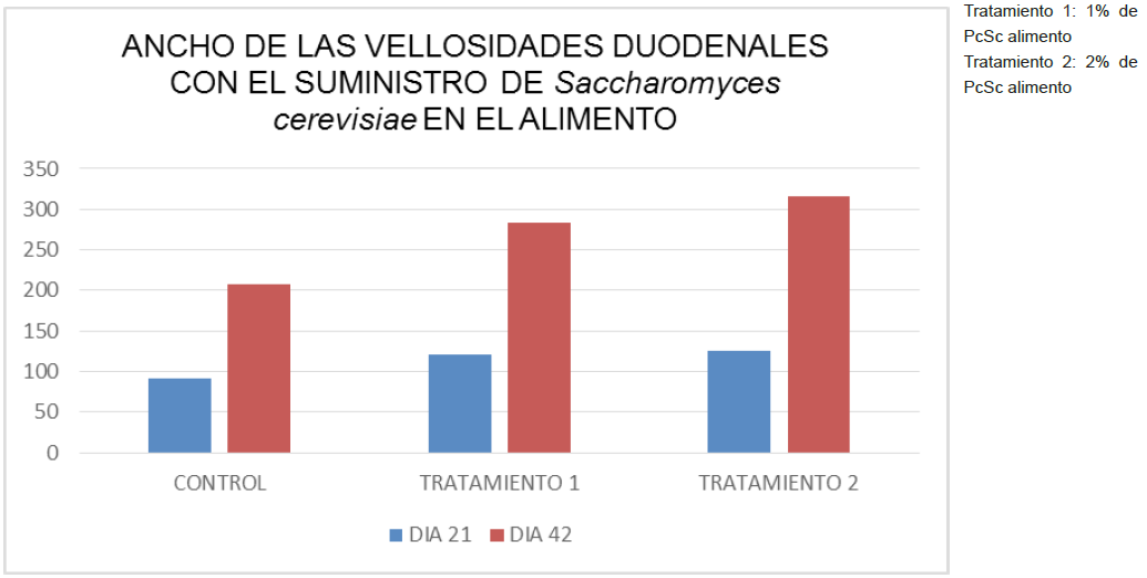 Los resultados obtenidos en este estudio mostraron que la adición de la levadura Saccharomyces cerevisiae a un porcentaje de 1 y 2% de la dieta tuvieron un efecto sobre el desarrollo de la vellosidad a nivel duodenal comparada con el grupo control.