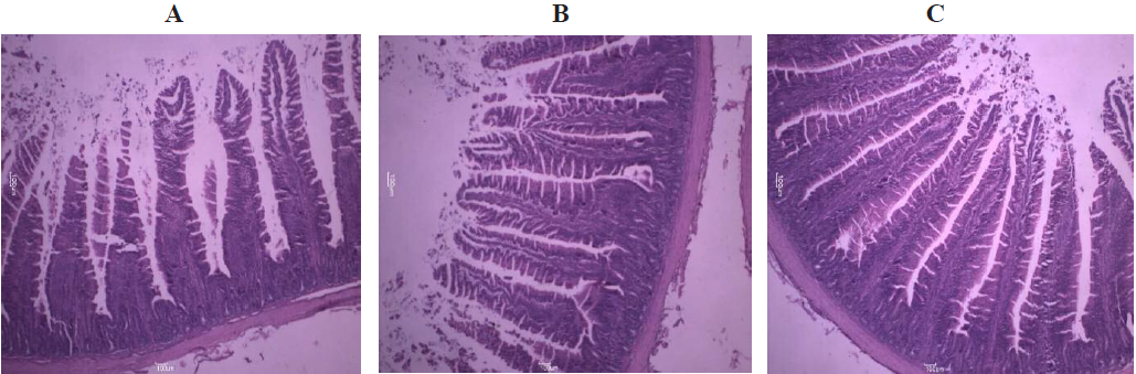 Los d 21 y 42 de edad, se seleccionaron 3 aves de cada grupo y de cada replica, las aves fueron pesadas y posteriormente sacrificadas por el método de dislocación cráneo-cervical, para seguidamente tomar dos muestras de dos centímetros de longitud de la porción craneal y caudal del duodeno, las muestras fueron procesadas para el análisis histológico en un laboratorio privado con la técnica de coloración Hematoxilina- Eosina (H- E), se procedió a observar, medir y analizar las vellosidades intestinales utilizando un microscopio BA 210 LED trinocular con cámara digital Moticam® en aumento de 10X, ubicado en el laboratorio de Ciencias Básicas de la Fundación Universitarias Juan de Castellanos (Ciudad: Tunja. Departamento: Boyacá, País: Colombia). Los cambios morfométricos de longitud fueron medidos desde la base de la vellosidad (lámina propia) hasta su ápice (lumen del duodeno) y el ancho de la parte basal de la misma, las mediciones se realizaron utilizando escala de micras.