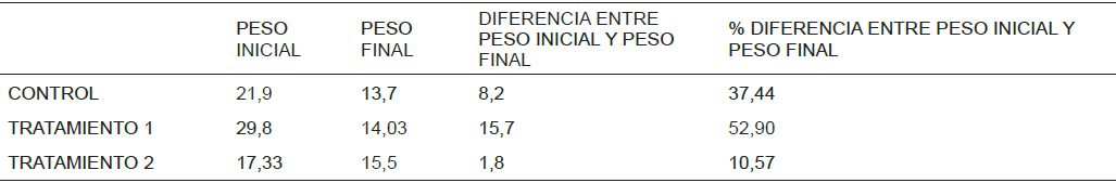 El efecto de la inclusión de levadura en la dieta de las aves, sobre la fuerza de corte del musculo de la pechuga y la pérdida de agua por goteo, presentó diferencias significativas (P<0,05) existe una diferencia marcada entre el peso inicial y el peso final de las tiras de pechuga para los grupos control y tratamiento 1; siendo en este último más elevado frente al grupo tratamiento 2 que muestra un porcentaje de pérdida de agua por goteo más bajo (TABLA I).