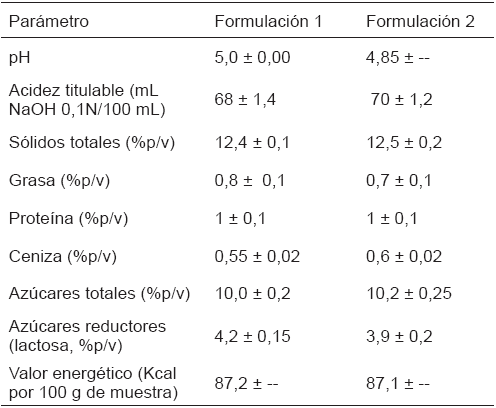 El contenido de azúcares en las bebidas fermentadas es información relevante para el consumidor que busca características nutricionales específicas de los alimentos, y más en aquellos que se promocionan como saludables. El contenido de azúcares totales fue similar para las dos bebidas, 10% para la Formulación 1 y 10,2% para la Formulación 2. La determinación del contenido de azúcares reductores es una medida indirecta del progreso de la fermentación. La lactosa es el principal sustrato para el crecimiento microbiano; su valor debe ser menor en el LS fermentado que en el LS sin fermentar, pues es consumida por los microorganismos durante el proceso. Los valores de 4,2 y 3,9% de azucares reductores, expresados como lactosa, encontrados para la Formulación 1 y 2, respectivamente, son menores en comparación con el valor de 5,75% de lactosa y minerales del LS sin fermentar (TABLA I). Estos resultados le confieren a las bebidas un atractivo nutricional para los consumidores parcialmente intolerantes a la lactosa, pues la misma se ve disminuida en más de un 20% aproximadamente después del proceso de fermentación para ambas formulaciones. El valor energético de las bebidas fue similar, con valores de 87,2 y 87,1 calorías/100 g para las Formulaciones 1 y 2, respectivamente, dándoles es un atractivo nutricional, pues son formulaciones de bajo aporte calórico.
