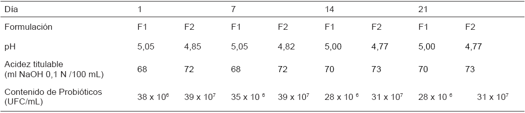 Al mantenerse estable el contenido de probióticos, en 106 y 107 UFC/mL, para la Formulación 1 y 2, respectivamente, durante los 21 d de conservación, las bebidas conservan su carácter probiótico durante todo el tiempo de vida útil en anaquel, cumpliendo con lo requerido tanto por Norma venezolana COVENIN 2394-2001 para yogurt [5] como por la Norma internacional CODEX 243- 2003 para leches fermentadas [2]. Es importante resaltar que entre mayor sea el exponente del crecimiento microbiano, mayor es el beneficio desde el punto de vista probiótico [2].