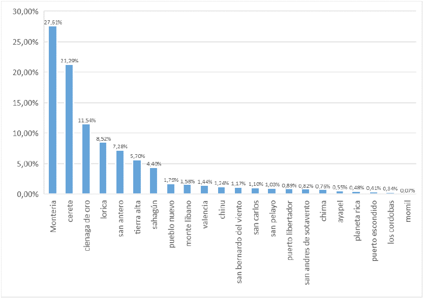 En la FIG. 1 se observa la distribucion de la causistica por cada Municipio, evidenciando atencion en el 73% (22/30) de los Municipios del Departamento, siendo Monteria (27,61%), Cerete (21,29%), Cienaga de oro (11,54%), Lorica (8,52%), San antero (7,28%), Tierra Alta (5,7%) y Sahagun (4,4%) los mas atendidos, agrupando 86,33% de los casos.