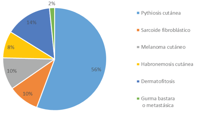 En la FIG. 3 se discriminan los principales diagnósticos asociados a las alteraciones del sistema tegumentario, estableciendo que la mayor cantidad de casos se dio por Pythiosis (56%), seguido de dermatofitosis (14%), Sarcoide (10%) y melanoma cutáneo (10%).