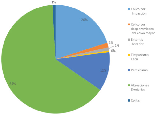 Las alteraciones del sistema digestivo en este estudio se debieron principalmente a alteraciones dentarias (65%), cólico por impacción (20%) y parasitismo (12%) respectivamente, lo que difiere de lo reportado en la Clínica San Luis en el departamento de Antioquia, donde las consultas por alteración del tracto gastrointestinal se debieron principalmente a desplazamiento del colon mayor (10,2%), seguido de dilatación gástrica por fermentación (5,5%), obstrucción de colon mayor (5,1%), impacción del colon mayor (4,7%), Impacción de colon menor (2,5%), colitis (2,5%) y torsión intestinal (2,5%) [24], mientras que en Brasil se reportó desplazamiento de intestino (21,5%) como la alteración más común en animales posmortem seguida por la obstrucción y la impacción (17,7%) [27].